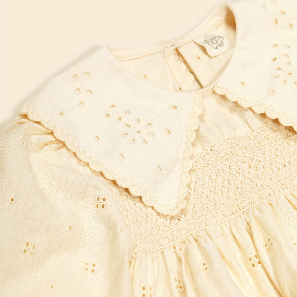New this season, the beautiful Cornelia blouse is crafted from our bespoke linen broderie anglaise. With gently puffed sleeves and delicate hand smocking at the chest that releases to a sweet shape. Cornelia features hand-smocked cuffs and a scallop crochet trim to her statement collar. We love Cornelia styled under dungarees or pinafores for a statement.