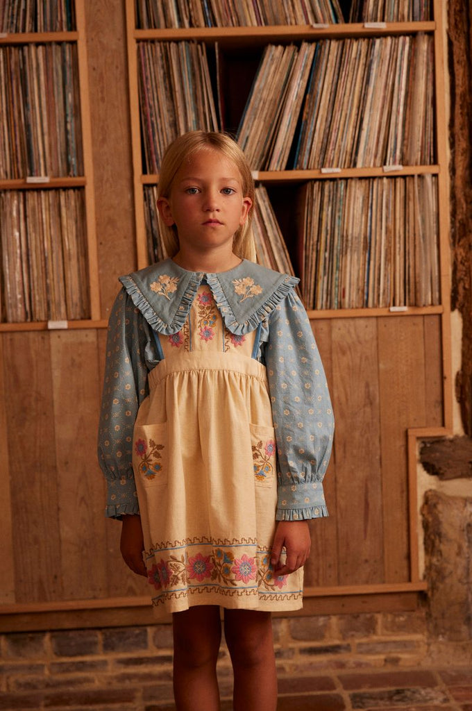 Dionne Blouse-Quilt Calico Blue Pebble. he vintage-inspired Dionne blouse is crafted in the season’s ‘quilt calico’ cotton. Featuring gently puffed sleeves with ruffle cuffs, and rows of pintucking at the chest that release to a sweet shape. Her statement frilled collar features Apolina’s signature contrast embroidery. Invisible zip closure at back. We love Dionne layered under pinafores or dungarees.