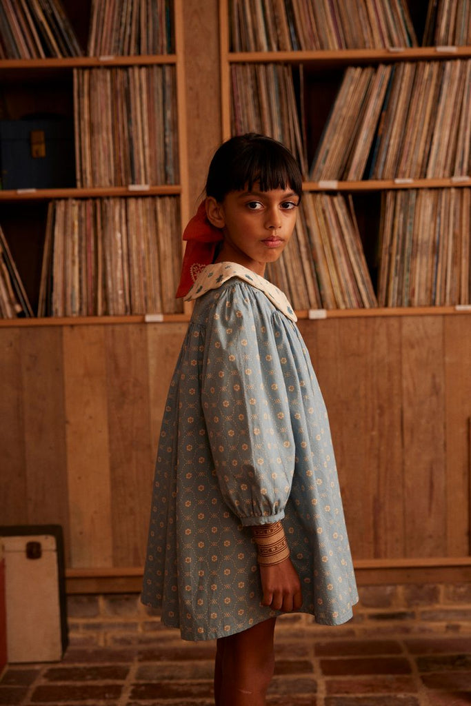The sweetest 1950s retro-inspired dress, Esther is crafted from our ‘quilt calico’ cotton in blue pebble. Featuring a vintage scalloped collar with simple soft blue toned embroideries. Esther is an easy pull-on style with keyhole fastening at front. We love her for everyday wear and occasions.