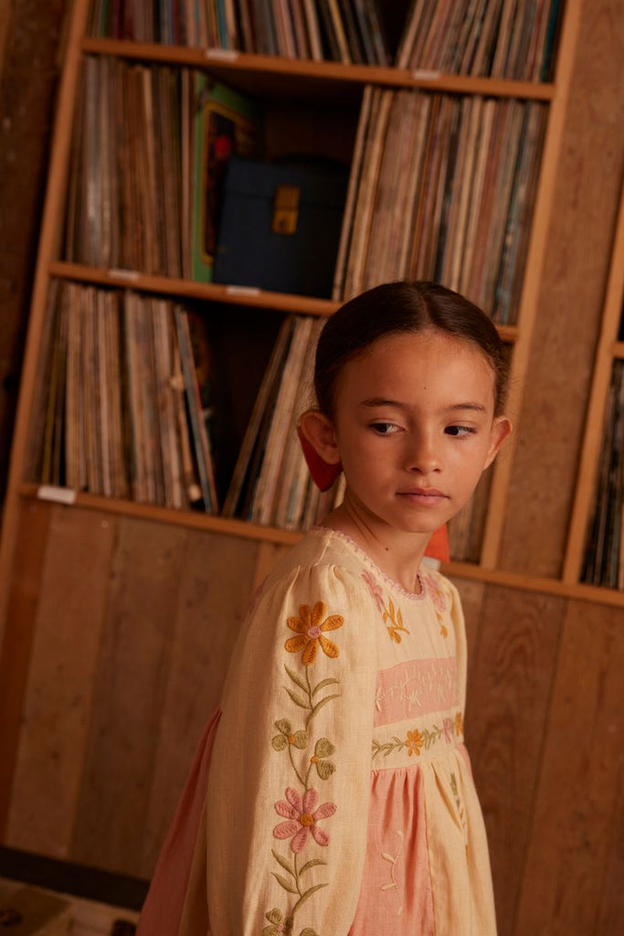 Our much-loved ‘Pascale’ dress is a stunning, 1950s-inspired dream. Crafted from many different panels of cashew and ribbon pink linen, and embroidered all over in a retro palette, Pascale makes the prettiest statement. Finished with a hand crochet trim and French seams throughout. She is the perfect dress for special winter occasions. Invisible zip fastening to centre back. We love Pascale paired with socks and boat shoes for modern, casual styling.