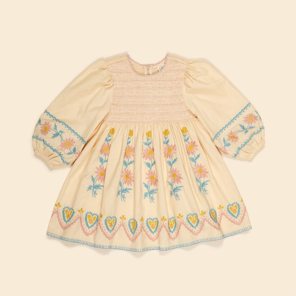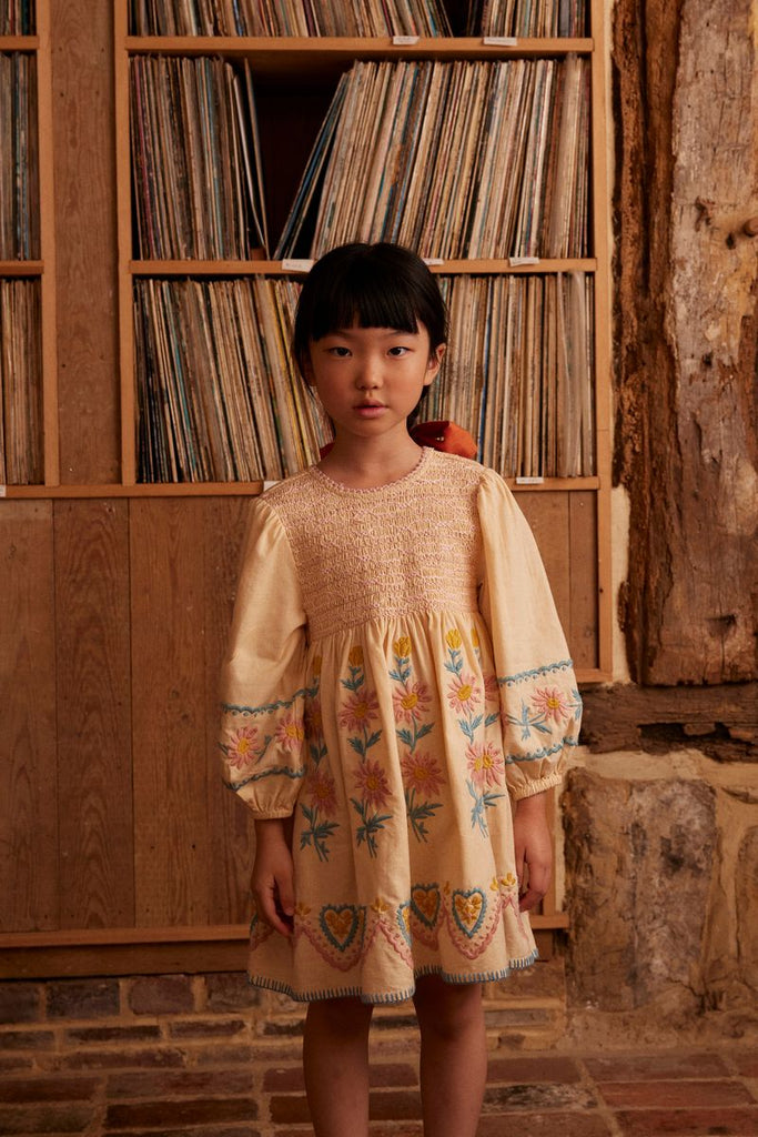 The stunning new Penny smock dress is a statement style crafted from our pink, beige rustic cotton-linen. Penny showcases beautiful statement embroideries in the season’s pastel tones to her skirt and sleeves. Featuring hand smocking and contrast stitching at chest, hand finishing at neckline and hem, gently puffed sleeves and a full skirted silhouette. Invisible zip closure at back. Penny’s pretty folk mood makes her a special choice for any occasion. We love her worn with socks and Mary Janes.