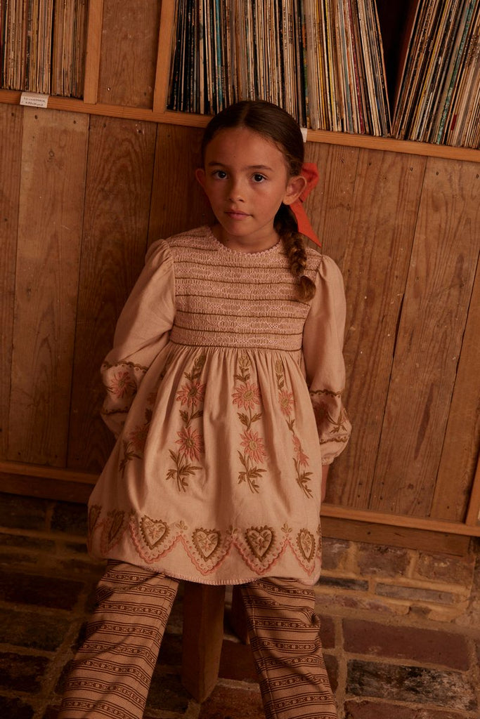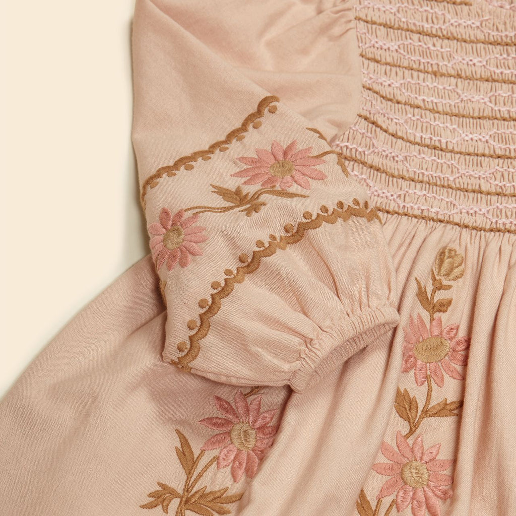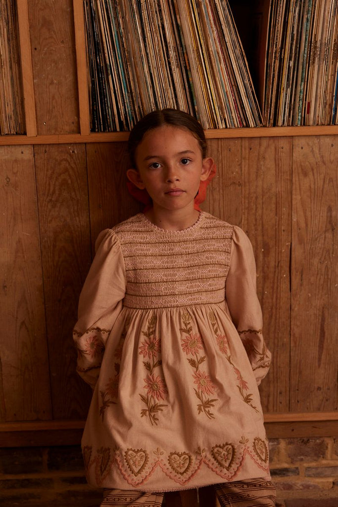 The stunning new Penny smock dress is a statement style crafted from our pink, beige rustic cotton-linen. Penny showcases beautiful statement embroideries in the season’s pastel tones to her skirt and sleeves. Featuring hand smocking and contrast stitching at chest, hand finishing at neckline and hem, gently puffed sleeves and a full skirted silhouette. Invisible zip closure at back. Penny’s pretty folk mood makes her a special choice for any occasion. We love her worn with socks and Mary Janes.