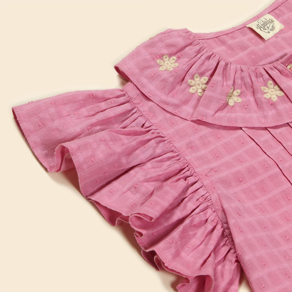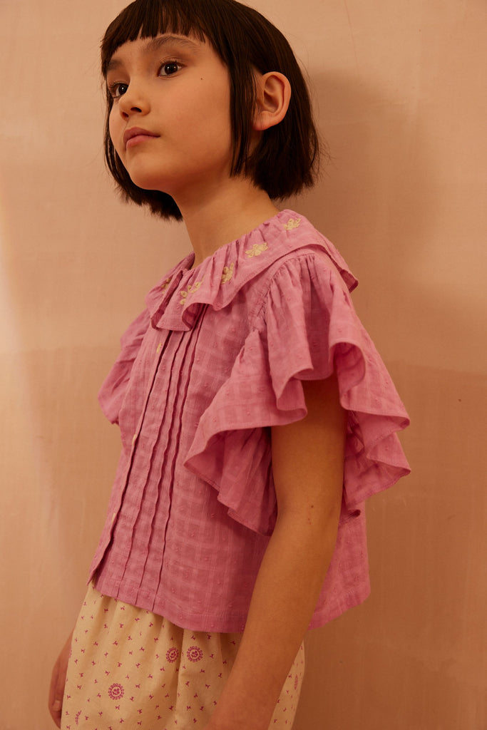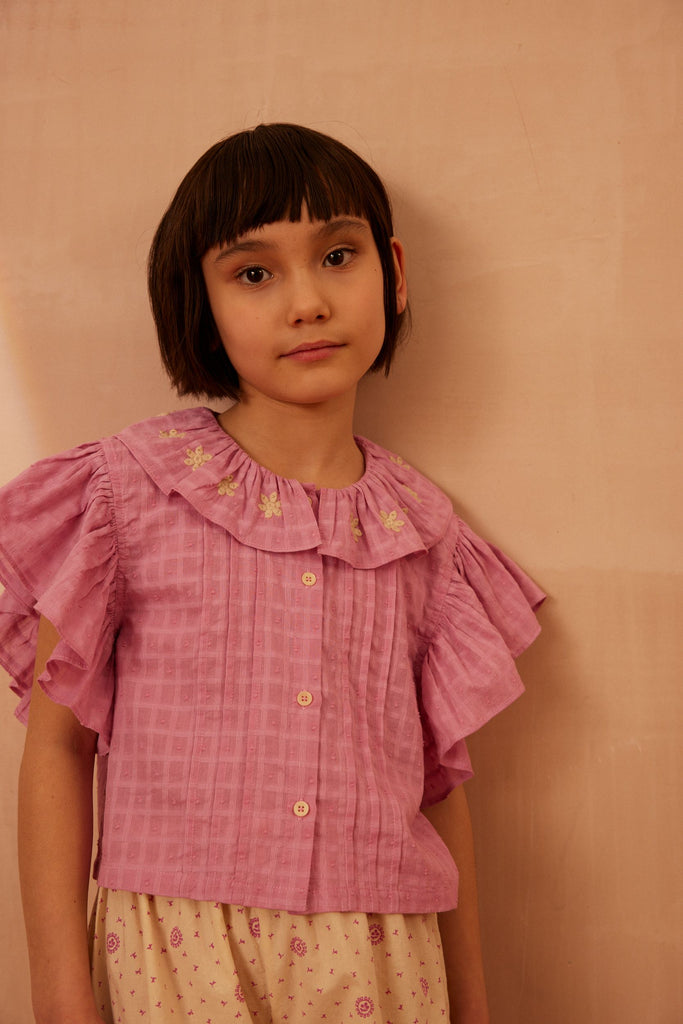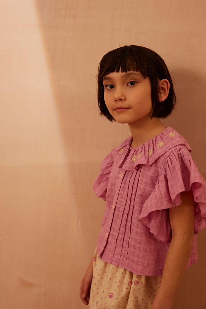 Silvie is a special vintage-inspired blouse with a sweet girly mood. Crafted from the prettiest ‘dahlia’ dobby soft cotton, with contrast cream embroideries trimming her frill collar. Featuring pintuck pleating and button through front. With a sweet, slightly cropped silhouette, Silvie isperfect for layering over dresses and pairing with our high waist shorts and trousers dungarees