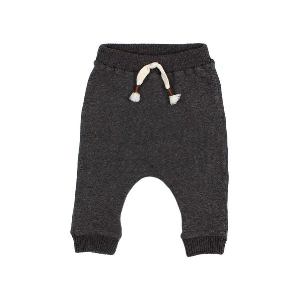 Long soft jogger style pants. Elastic waist with decorative drawstring. Ribbed cuffs.