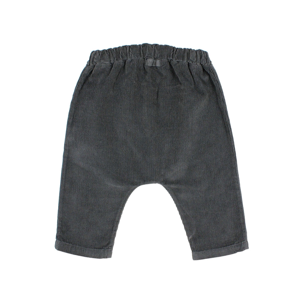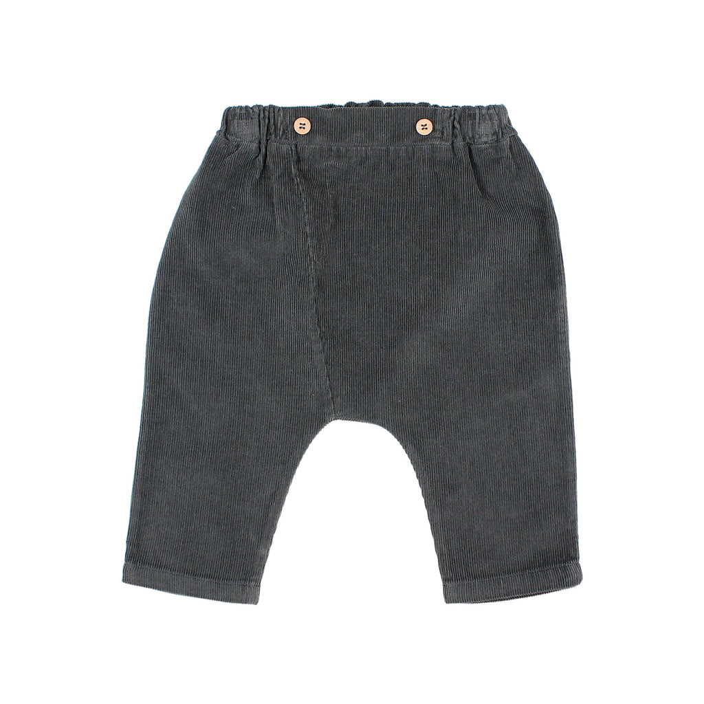 Long micro corduroy pants. Elastic waist with two decorative buttons on the front.