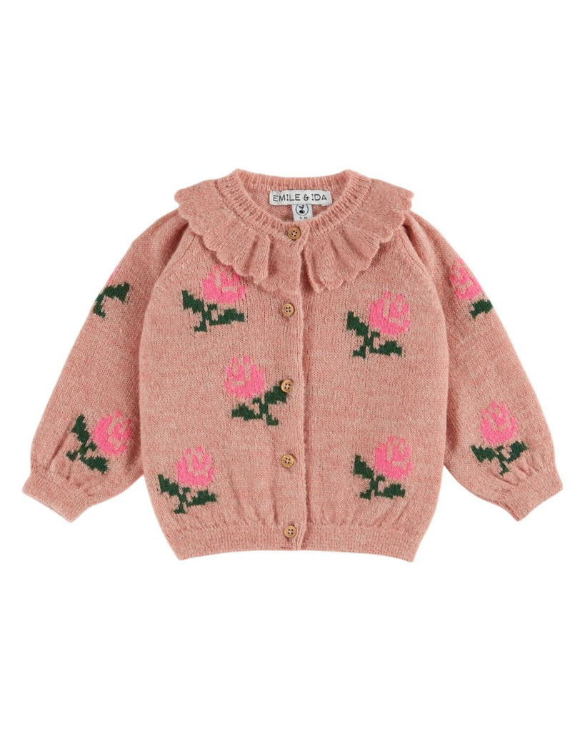 Rose mohair wool cardigan dotted with large pink roses. Knitted in stockinette stitch. Round neckline delicately bordered by a scalloped collar. Wooden buttons close the button placket lined with a jersey band. Blend with synthetic fibers for added softness
