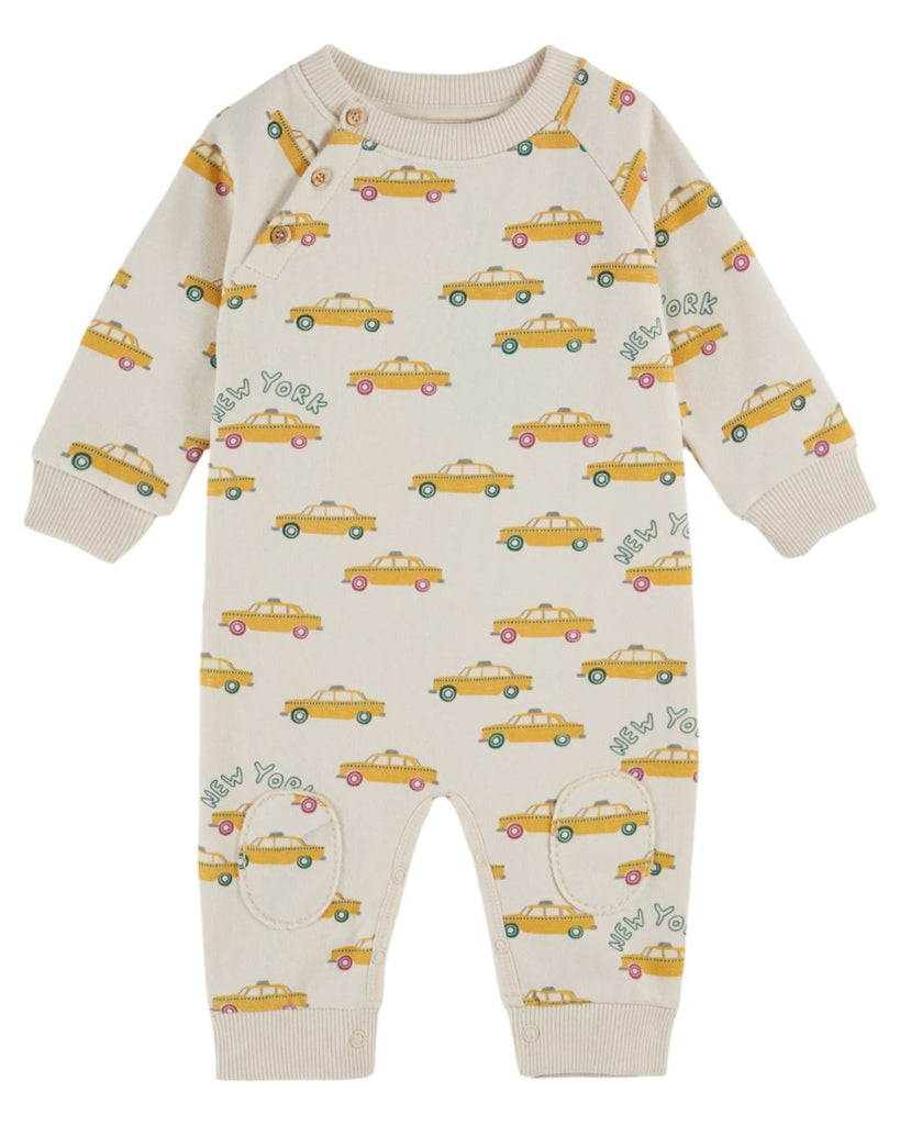 Velour jumpsuit in ecru color with all-over yellow New York cabs. Buttoned opening in sleeve raglan and snaps between the legs for easy changing.