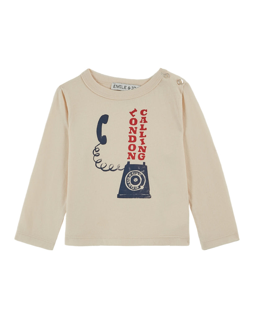 Long sleeve t-shirt in creme with telephone print. Buttons on shoulder for baby sizes.
