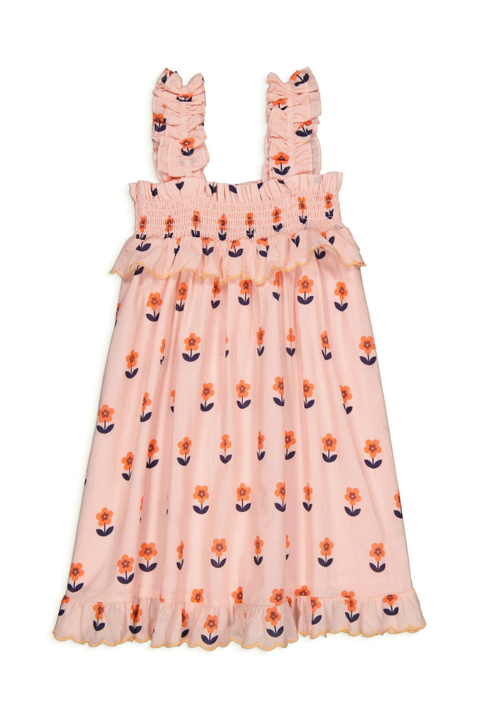 Long voile strappy dress in all-over print with elastics and ruffles on straps. Elasticated smocks at yoke with little ruffle on top. Flying below yoke and at bottom with scallops.