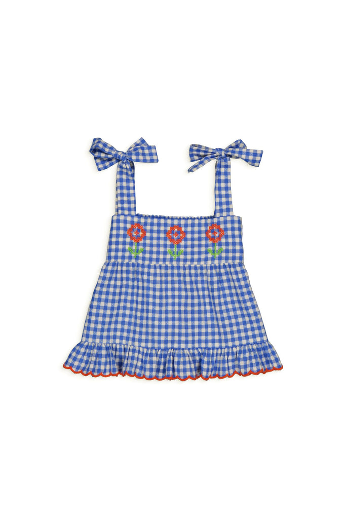 Vichy strappy blouse with bows on straps and elasticated smocks at back. Bottom