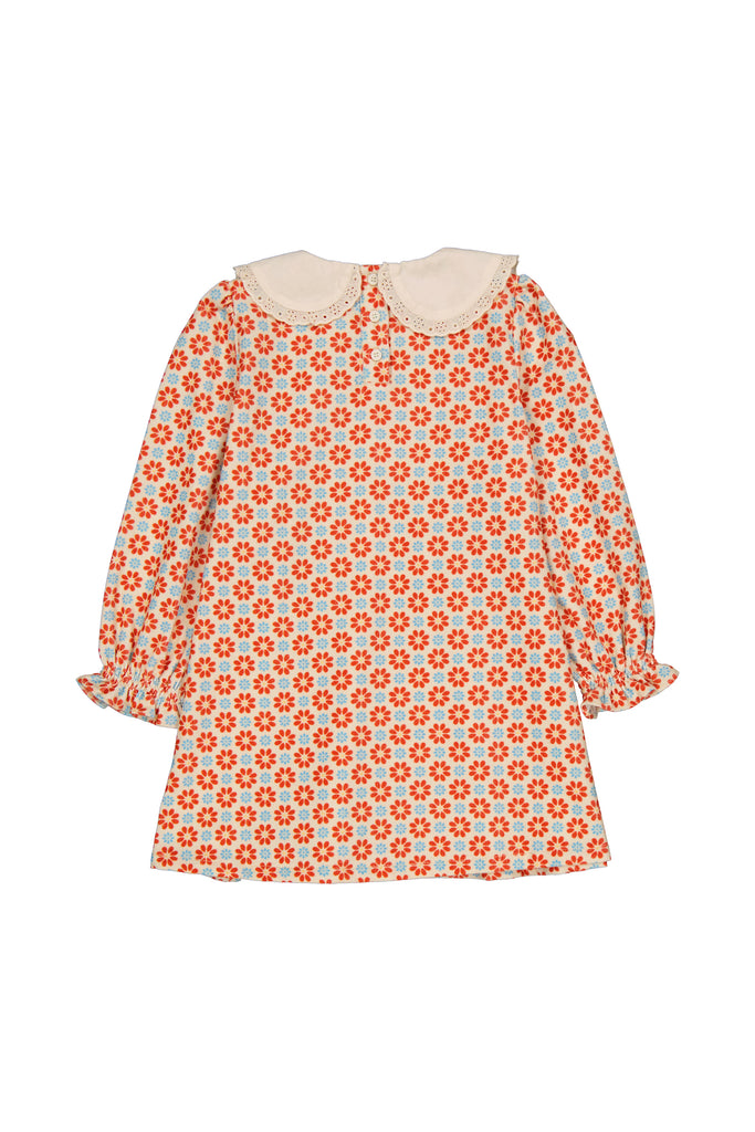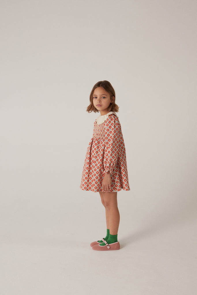 Dress in all over printed cotton corduroy with lace collar and smocked.
