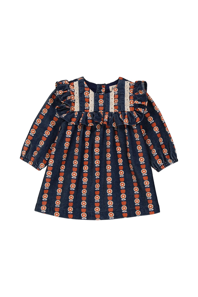 Baby dress in all over printed corduroy cotton with English embroidery on the front,