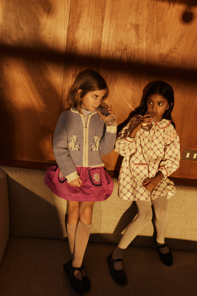 Voluminous short skirt corduroy with elasticated waist. Two front patch pockets edged with a contrasting applied ric rac and embroidered in the center.