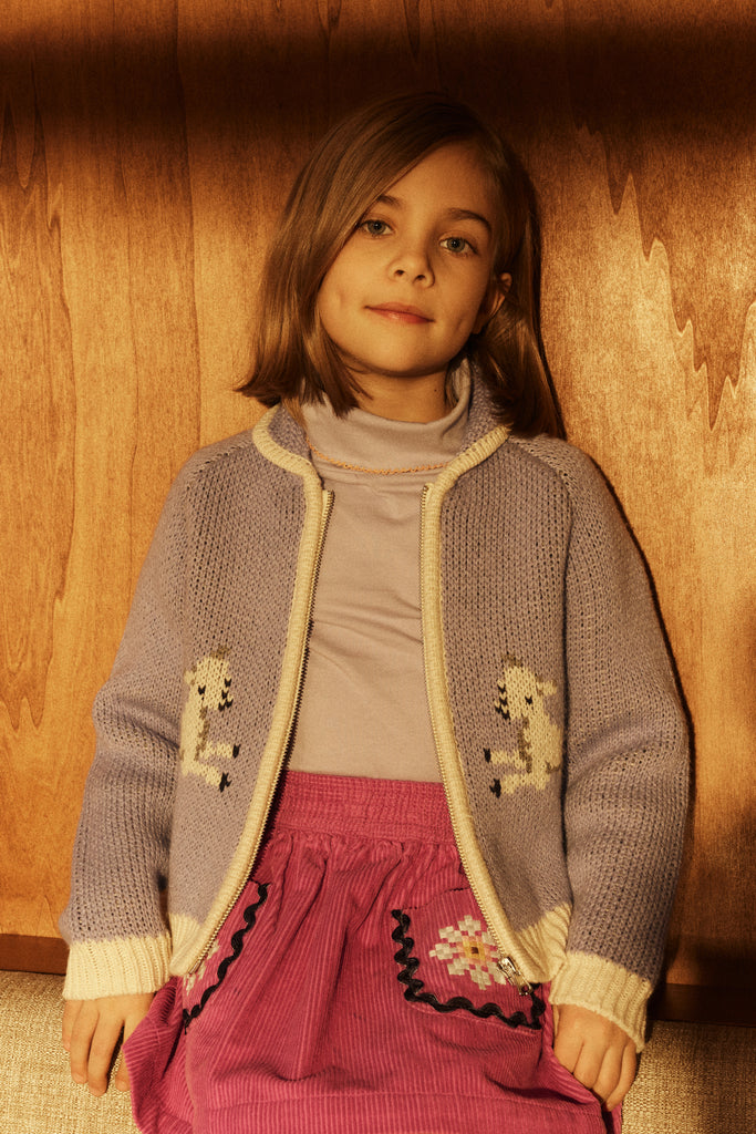 Knit cardigan with front zip and placed motif. Short fit, raglan armholes. Large, rounded collar. Contrast around collar, bottom of sleeve, bottom of body and around zip.
