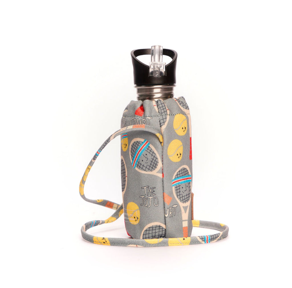 Water bottle in insulated interior RPET recycled polyester canvas, Fabric strap. Includes a stainless-steel bottle jojo laser engraving + 2 screw caps.