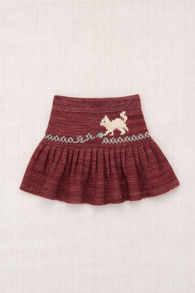 A skirt in Merino wool, featuring a skating silhouette, an intarsia kitten and yarn motif, and soft banded elastic waistband.