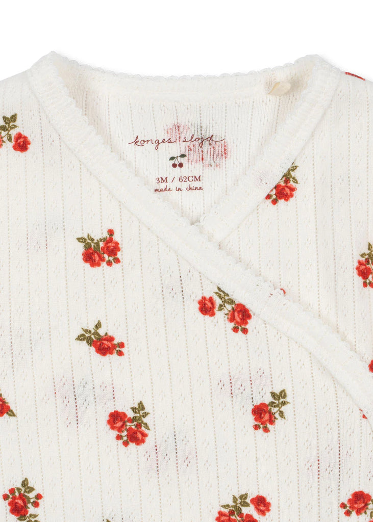 Soft onesie for newborns with a convenient wrap closure for easy dressing. Features snap buttons along the body and legs, and decorative pointelle pattern.