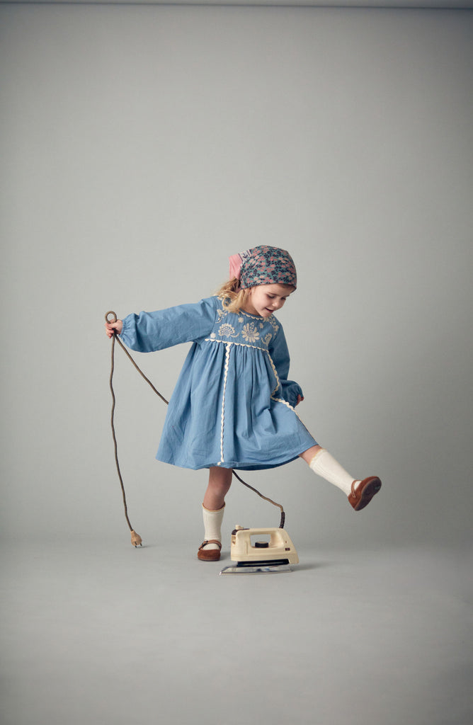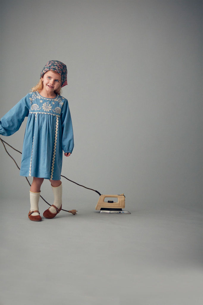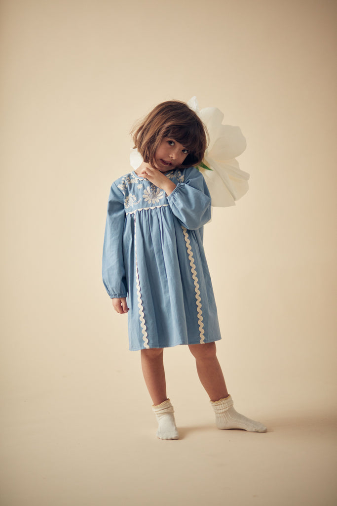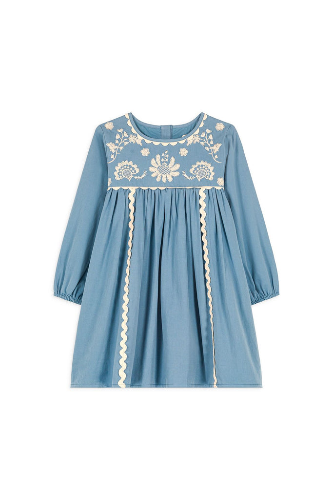 Linen and cotton denim style dress with round neckline, floral embroideries, rickrack details and elastic cuffs. Button placket at the back.