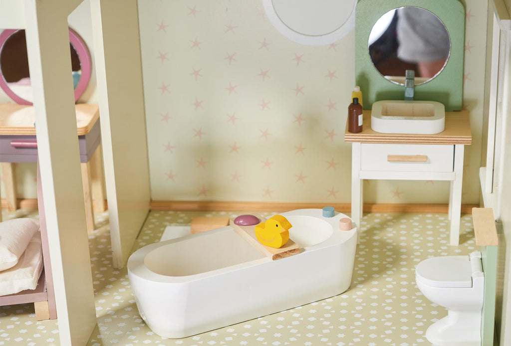 A large open-fronted wooden dolls house scaled for 9.84” / 25cm dolls. Beautiful contemporary soft colours and detailed illustrations make this house unique and premium. The gabled roof and attic space, opening shutters and front door with windows at the back panel allow light to flood into the spacious interior. Access to a balcony on the second floor gives extra interest and space to play. Furniture included.