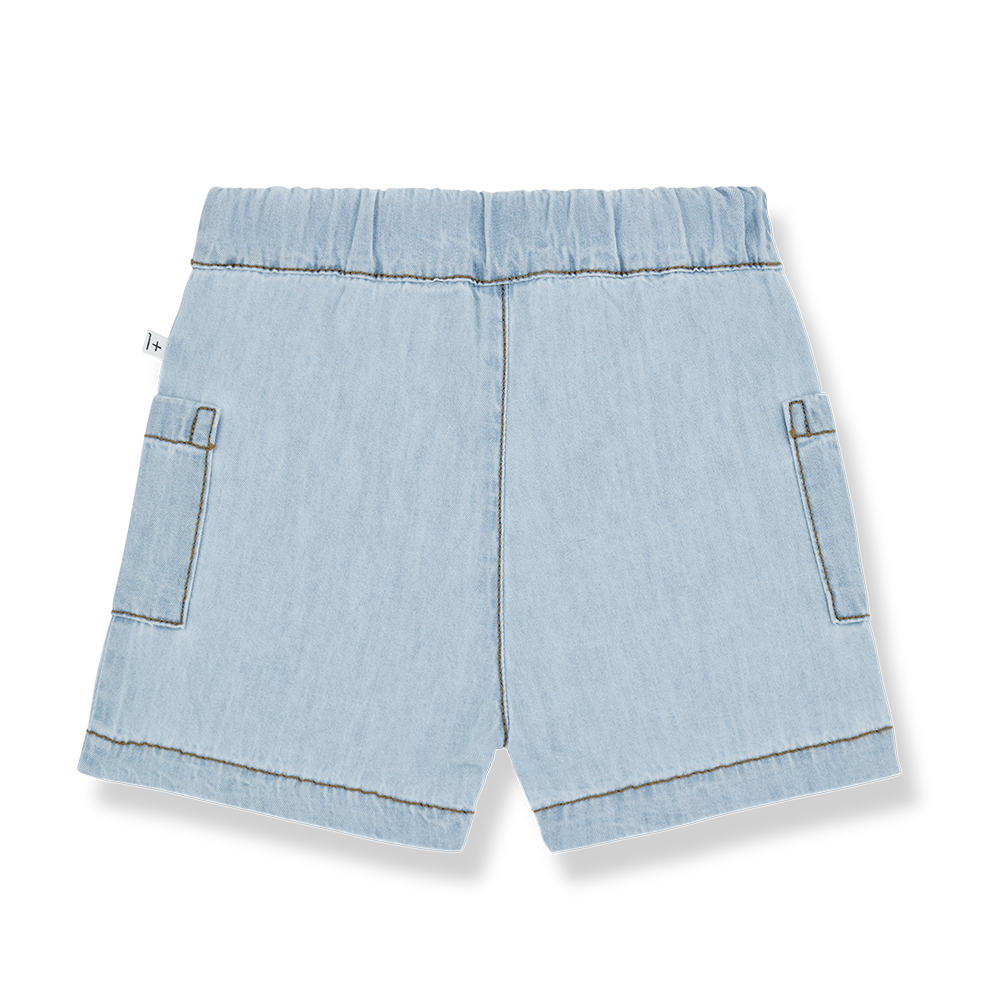 Bermuda denim shorts, featuring elastic waistband with decorative wood buttons on front. Big patch pockets on sides.