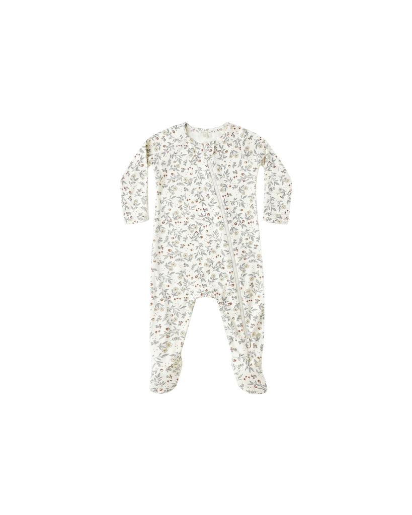 Full zip footie in soft and stretchy bamboo fabric, featuring a ‘woodland’ all-over print on ivory.