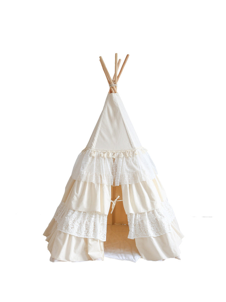 The amazing “Shabby Chic” Teepee with Frills is firmly sewn from thick cotton fabric. Its delicate beige tones of cotton, tulle, and lace are arranged into numerous elegant frills.