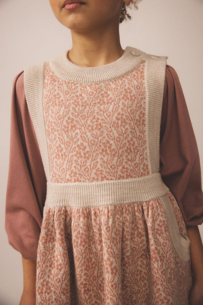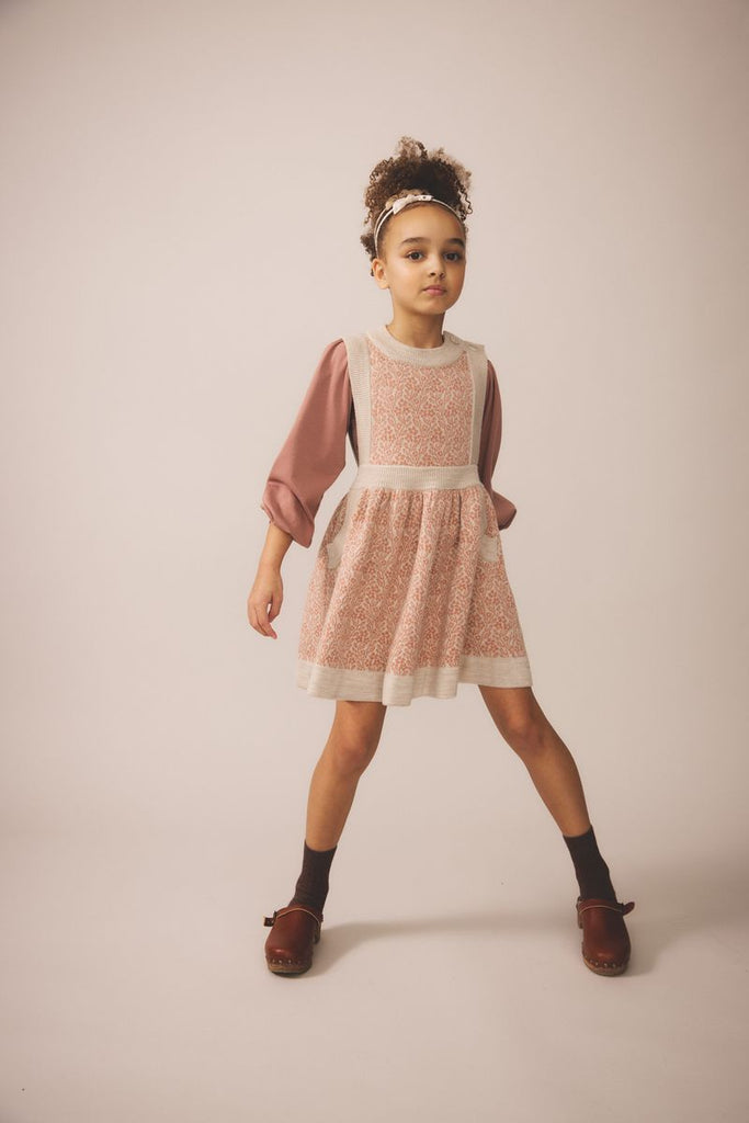 Full bodied pinafore in our double knit, double stitch jacquard. Natural horn buttons at shoulder, ribbed pockets and chunky rib finishing.