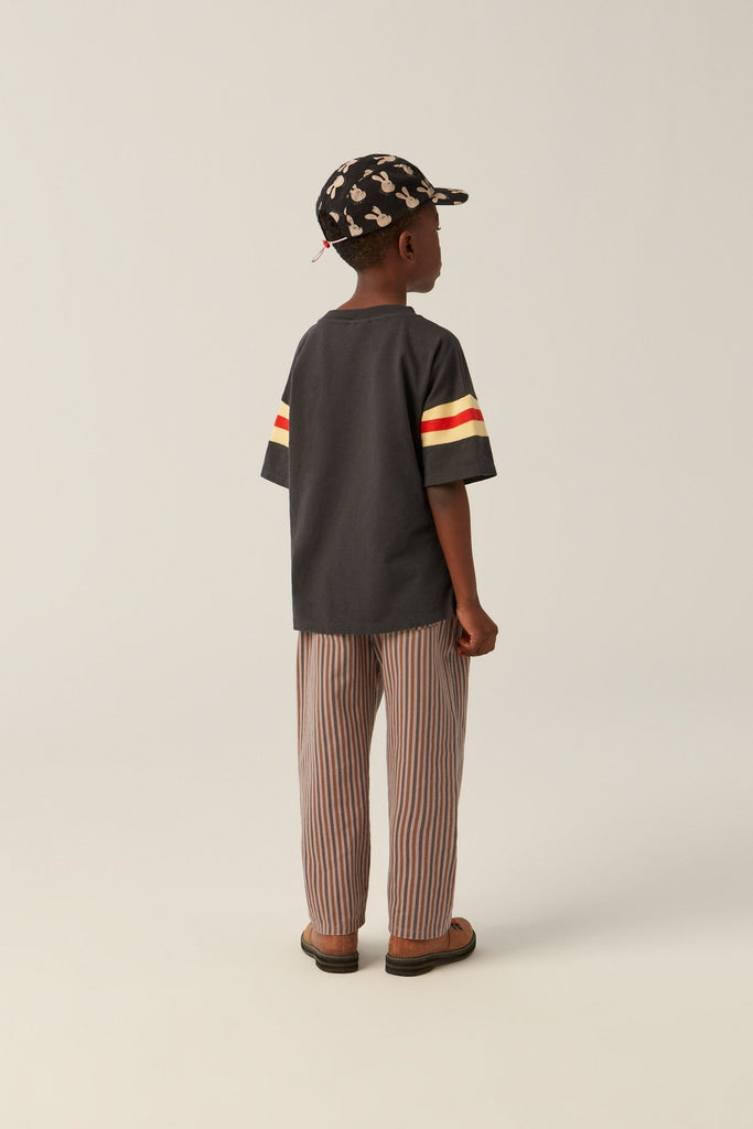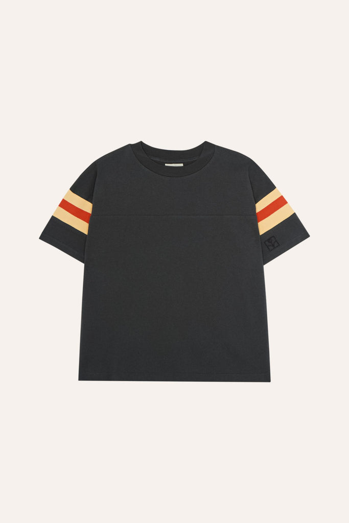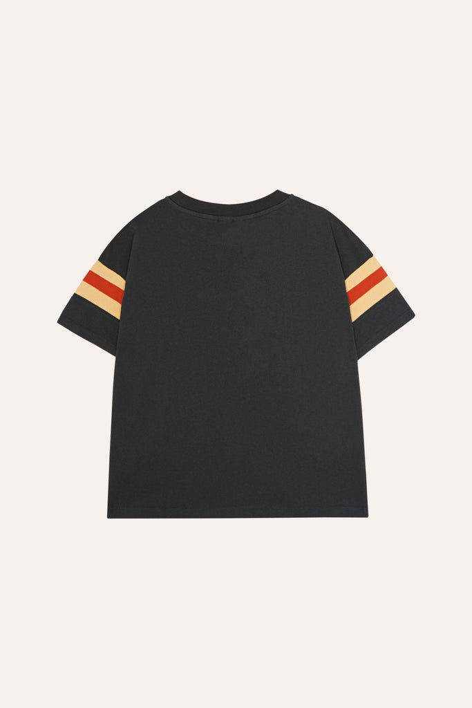 Short sleeve T-Shirt in dark grey with color bands on sleeves.