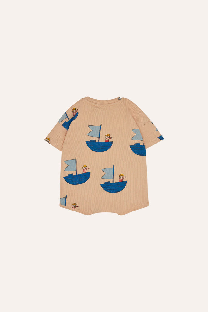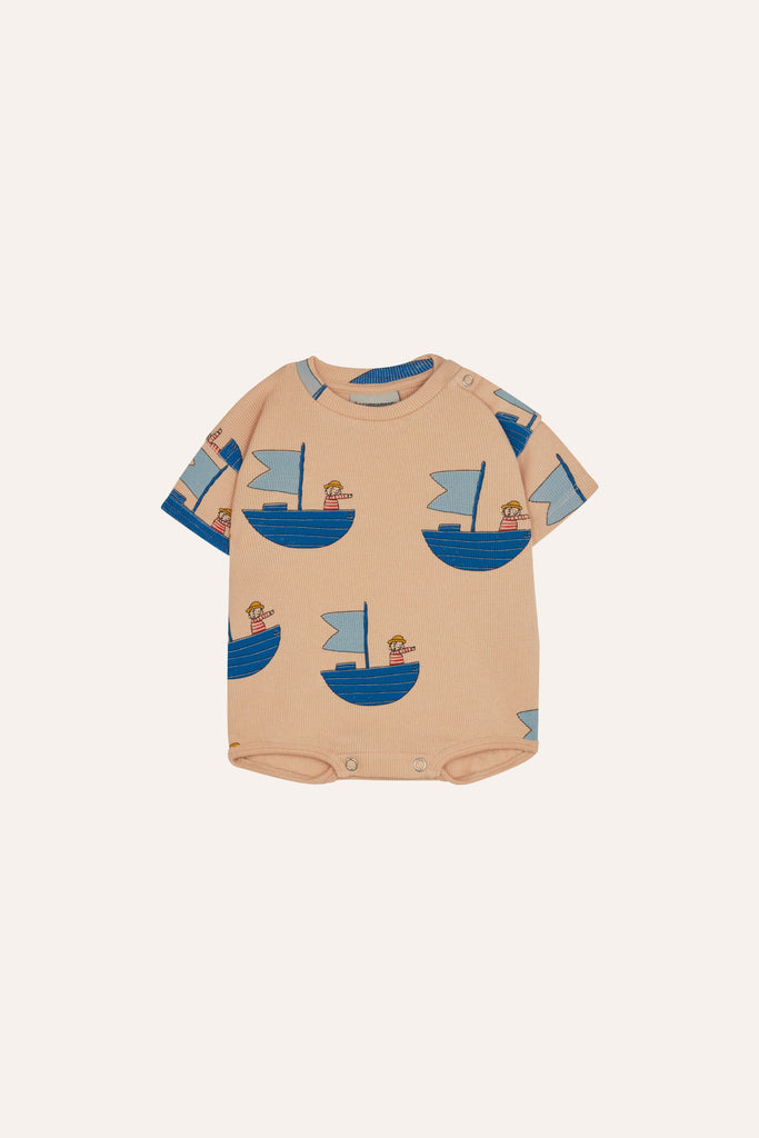 Short sleeve baby bodysuit with sailor print allover. Snap buttons between the legs for easy changing.
