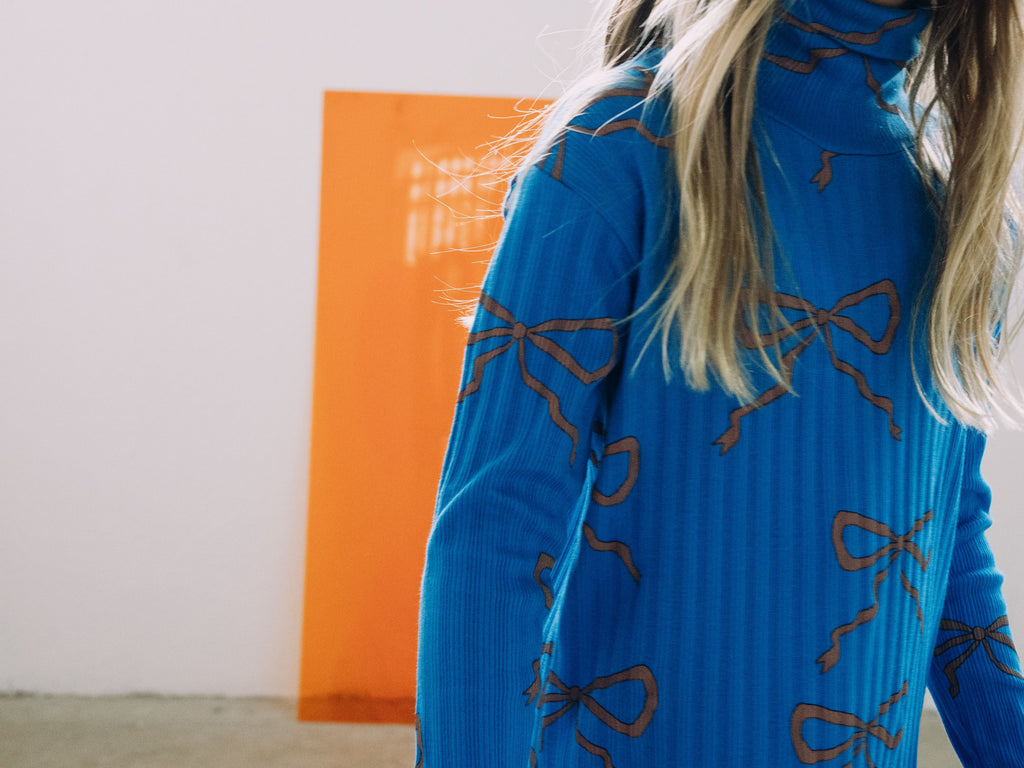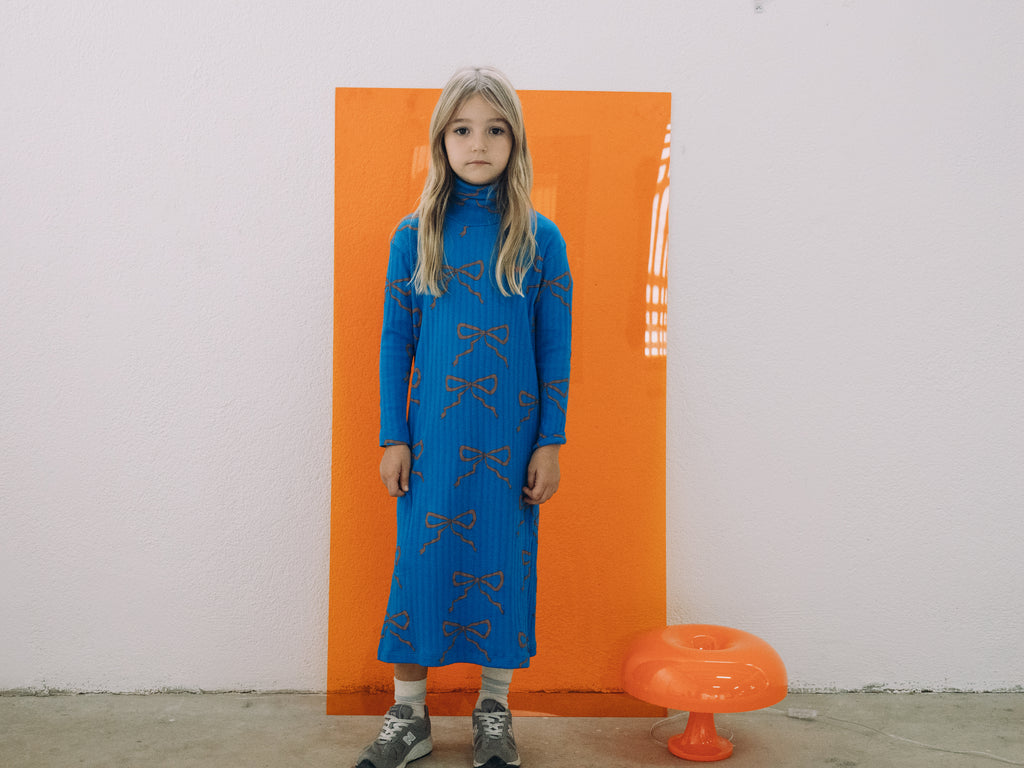 This long-sleeved cobalt blue midi dress with all-over bows print is made from cotton and elastane, ensuring comfort and durability. This dress has a rib texture, turtleneck and straight fit providing a relaxed and modern silhouette.