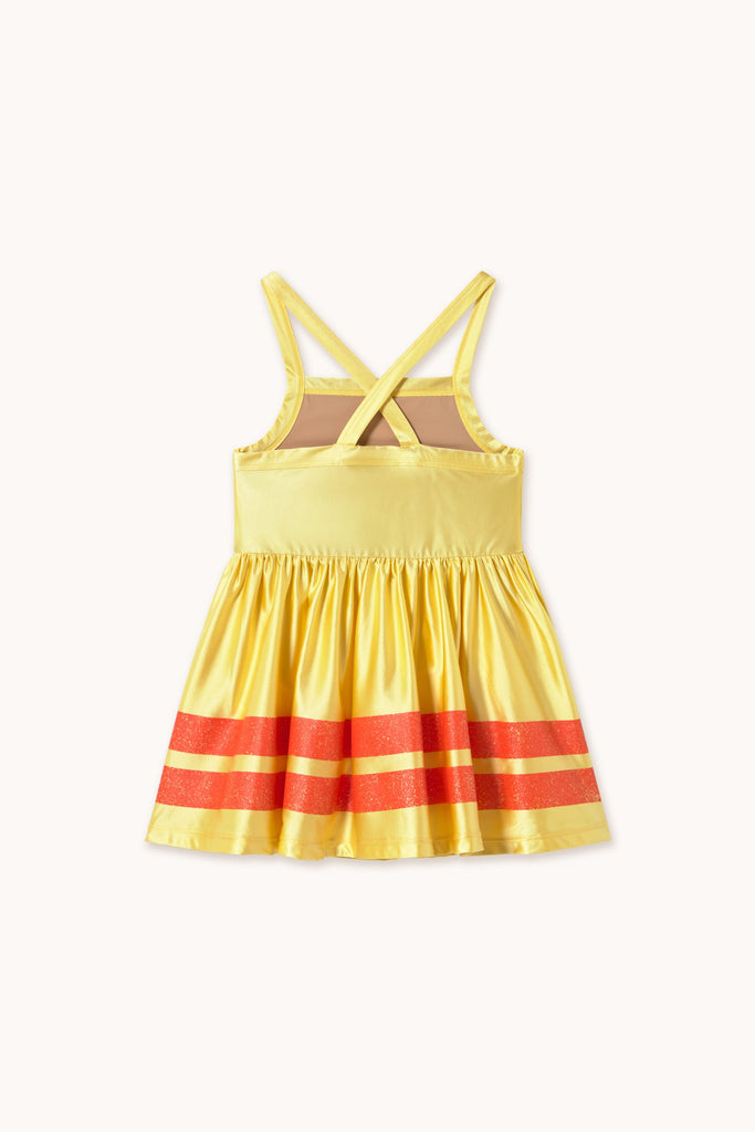 Hors and comfortable summer dress made from shiny, stretchy fabric in bright yellow, Two red contrast stripes and criss cross straps at back. .