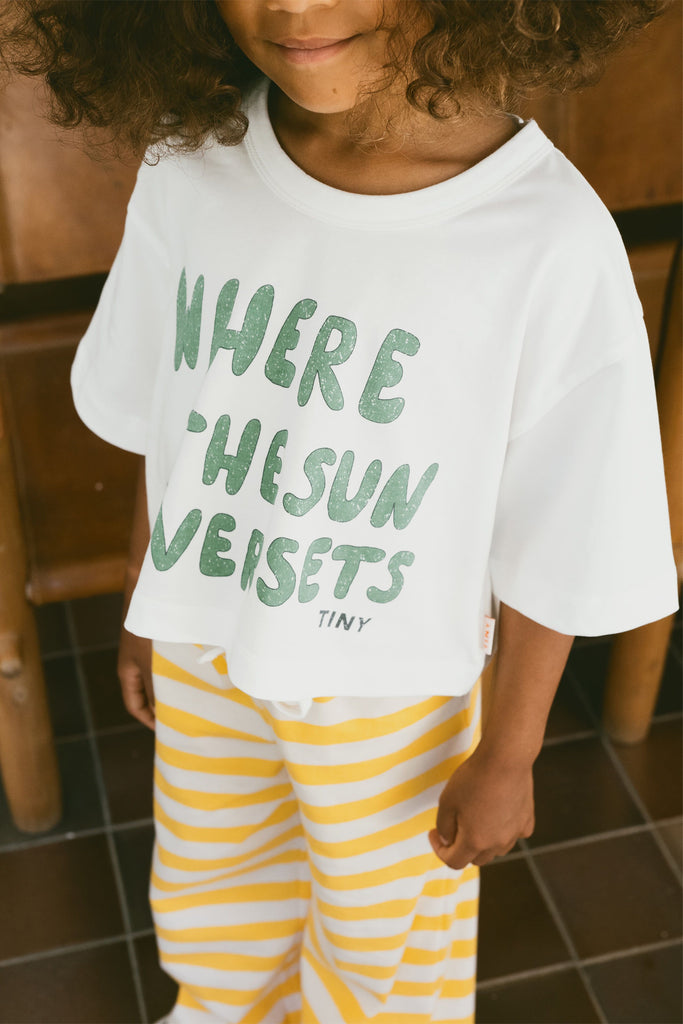 With a trendy crop cut and boxy fit, this tee is both stylish and comfortable. The sun graphic adds a playful touch to your outfit. Available in off-white. (Sun's out, crops out!)