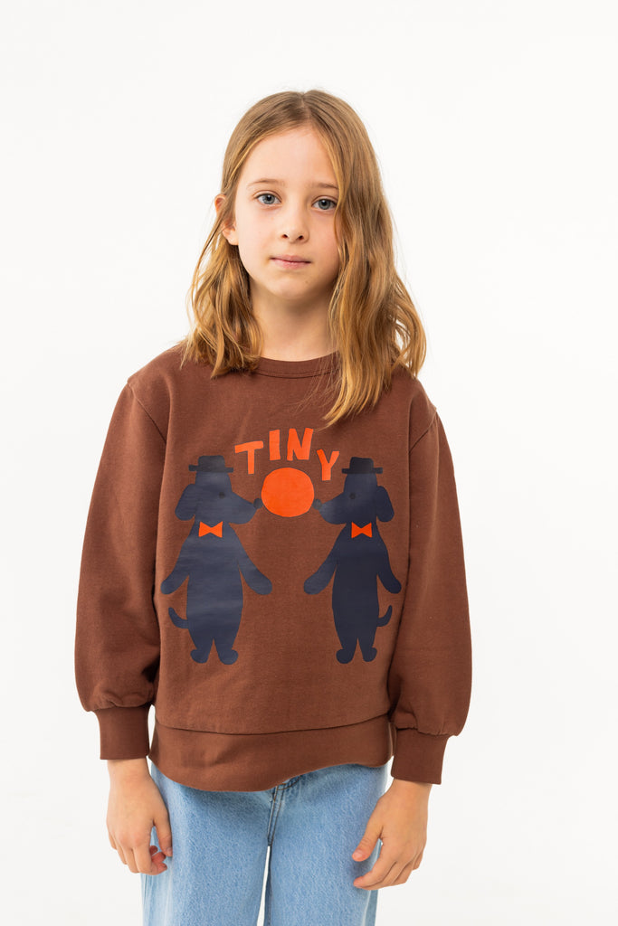 This chocolate brown sweatshirt featuring our Tiny Dogs graphic is made from 100% cotton. It has a round neckline and stretchy rib trims for a relaxed fit, providing comfort for daily use.