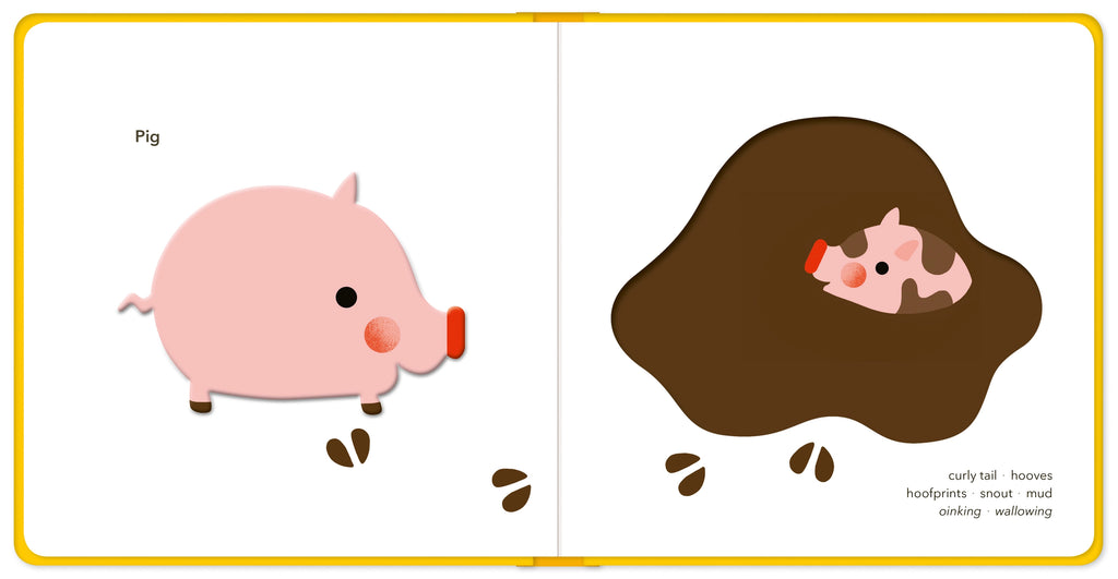 Discover—and experience—a pig by tracing its raised outline on one side and the concave form of the mud puddle it wallows in on the other. Clusters of related words on each spread offer parents and children a springboard for further conversations to encourage the language skills so crucial to later successful learning.