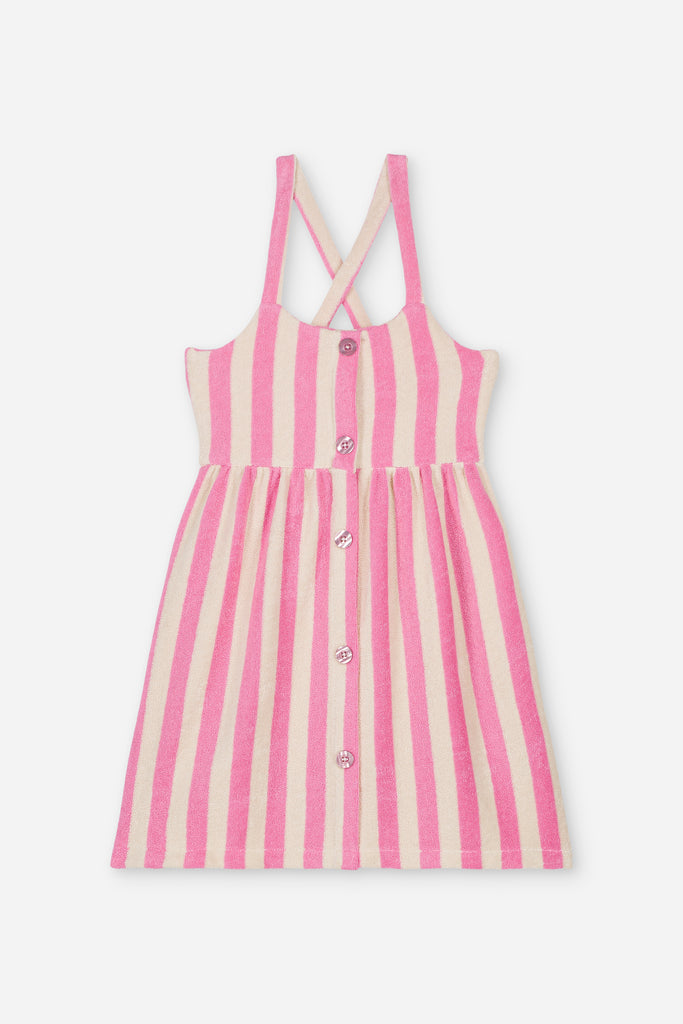 Terry dress with large straps crossed on the back and buttoned at front. Length under the knee.